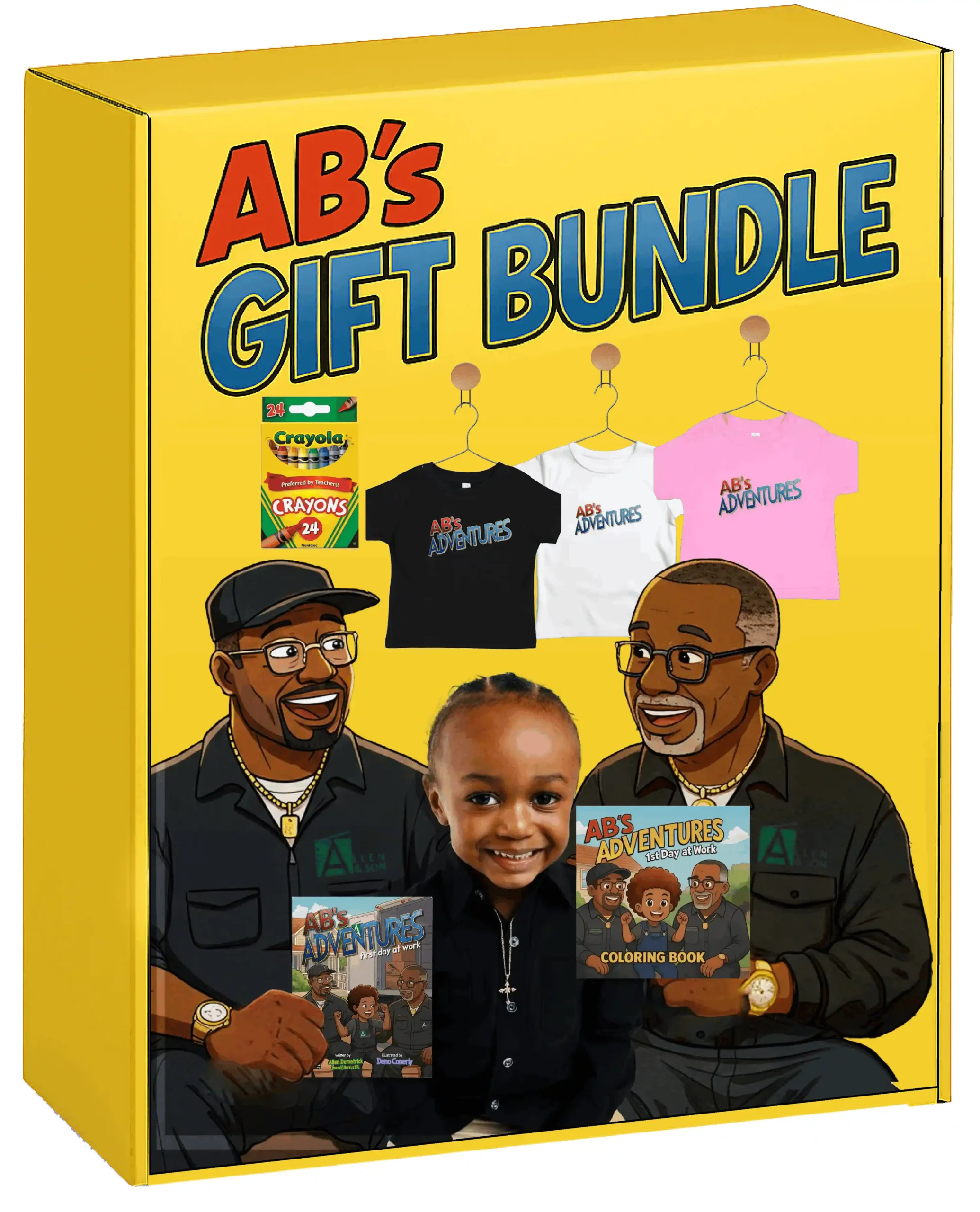 📘 AB’s Adventures Storybook🎨 AB’s Adventures Coloring Book👕 One AB’s Adventures T-Shirt (select size)🖍️ Bonus: Crayon Pack for coloring fun